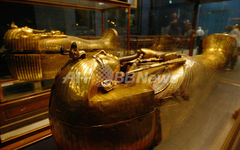 【10月24日 AFP】カイロ(Cairo)にあるエジプト考古学博物館(Egyptian Museum)で、古代エジプト王ツタンカーメン(Tutankhamen)の墓から発掘された宝飾物などが展示されている。展示の目玉の一つはツタンカーメンの黄金の棺。このほか胸飾りも注目を集めている。上部には太陽と月のエンブレム、中央に古代エジプト王朝のスカラベがはめ込まれ、下部にはカーネリアン(紅玉髄)、ラピスラズリ、カルサイト(方解石)、黒曜石、ターコイズなどの宝石と、赤、青、黒、白のガラスが埋め込まれている。(c)AFP