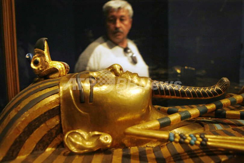 【10月24日 AFP】カイロ(Cairo)にあるエジプト考古学博物館(Egyptian Museum)で、古代エジプト王ツタンカーメン(Tutankhamen)の墓から発掘された宝飾物などが展示されている。展示の目玉の一つはツタンカーメンの黄金の棺。このほか胸飾りも注目を集めている。上部には太陽と月のエンブレム、中央に古代エジプト王朝のスカラベがはめ込まれ、下部にはカーネリアン(紅玉髄)、ラピスラズリ、カルサイト(方解石)、黒曜石、ターコイズなどの宝石と、赤、青、黒、白のガラスが埋め込まれている。(c)AFP