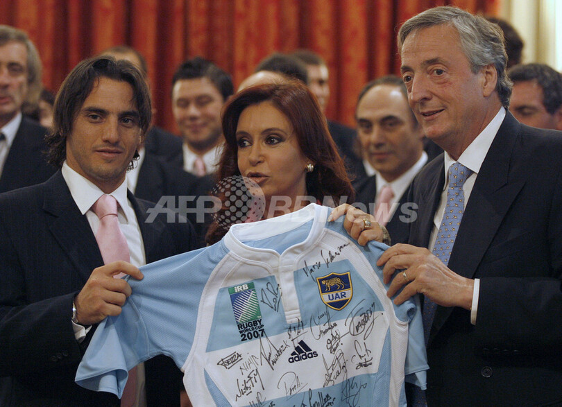 スポーツ ラグビー W杯3位のアルゼンチン代表 大統領と対面 2007年10月24日 15:11 発信地:ブエノスアイレス/アルゼンチン [ 中南米 アルゼンチン ] このニュースをシェア ‹ › ❮ 1/4 ❯ サイン入りのユニフォームを手に記念撮影を行う(左から)主将のグスティン・ピチョット(%%Agustin Pichot%%)、クリスティナ大統領夫人、キルチネル大統領。(c)AFP/JUAN MABROMATA 画像作成中 ! 【10月24日 AFP】07ラグビーW杯で3位に輝いたアルゼンチン代表は23日、大統領府カサ・ロサダ(Casa Rosada)を訪れネストル・キルチネル(Nestor Kirchner)大統領と上院議員で次期大統領選への出馬を表明しているクリスティナ・フェルナンデス・デ・キルチネル(Cristina Fernandez de Kirchner)大統領夫人と対面した。(c)AFP ラグビー 一覧へ> メディア・報道関係・法人の方向け 写真・動画 購入のお問合せ>