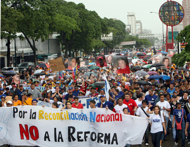 学生らは、チャベス大統領が示した憲法改正案はベネズエラを急速に社会主義化すると抗議し、「改革はノー、民主主義はイエス」と叫びながら通りを行進した。