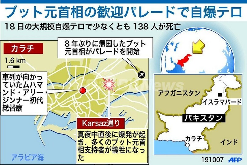 ニュース 政治・経済 図解 ブット元首相を狙った自爆攻撃が発生したカラチ 2007年10月22日 21:00 発信地:パキスタン [ アジア・オセアニア パキスタン ] このニュースをシェア (c)AFP 【10月22日 AFP】図は、ベナジル・ブット(Benazir Bhutto)元パキスタン首相を狙った自爆攻撃で、多数の元首相支持者らが死亡したカラチ(Karachi)の地図。(c)AFP<ニュース解説画像一覧へ> 政治・経済 一覧へ> メディア・報道関係・法人の方向け 写真・動画 購入のお問合せ>