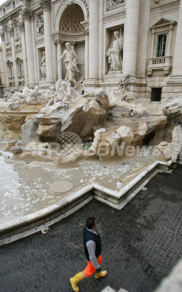 【10月25日 AFP】イタリアの首都ローマで22日、無政府主義者と称する一団によって染料を投げ込まれ赤く染まったトレビの泉(Trevi Fountain)の洗浄作業が行われた。