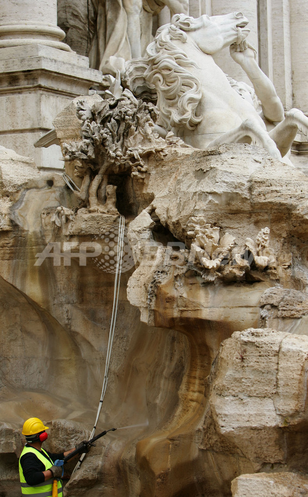 【10月25日 AFP】イタリアの首都ローマで22日、無政府主義者と称する一団によって染料を投げ込まれ赤く染まったトレビの泉(Trevi Fountain)の洗浄作業が行われた。