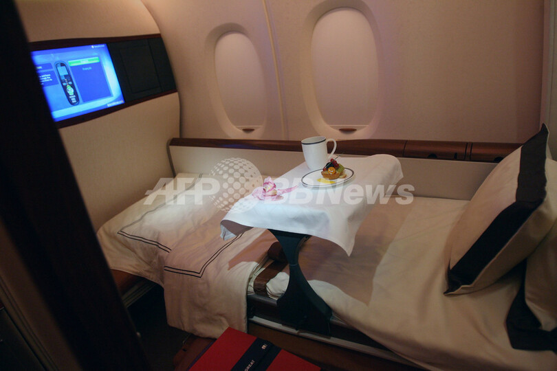 シンガポール航空の販売戦略の核は、引き戸で仕切られた12室の個室「スイート」。フランスのデザイナー、ジバンシー(Givenchy)の寝具を採用したフルサイズのベッドや最新の液晶テレビが備わっている。(c)AFP/Bernice Han
