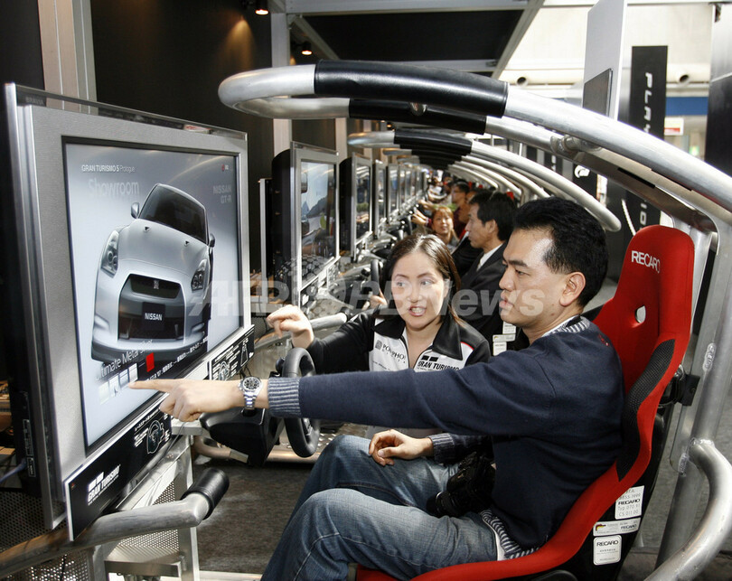 展示場で本物の新車を見た後は、ゲーム「グランツーリスモ(Gran Turismo)」シリーズの最新版でバーチャル「試乗」を体験できる。