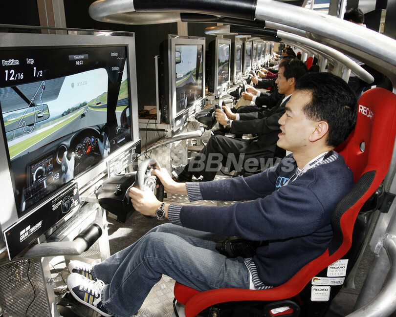展示場で本物の新車を見た後は、ゲーム「グランツーリスモ(Gran Turismo)」シリーズの最新版でバーチャル「試乗」を体験できる。