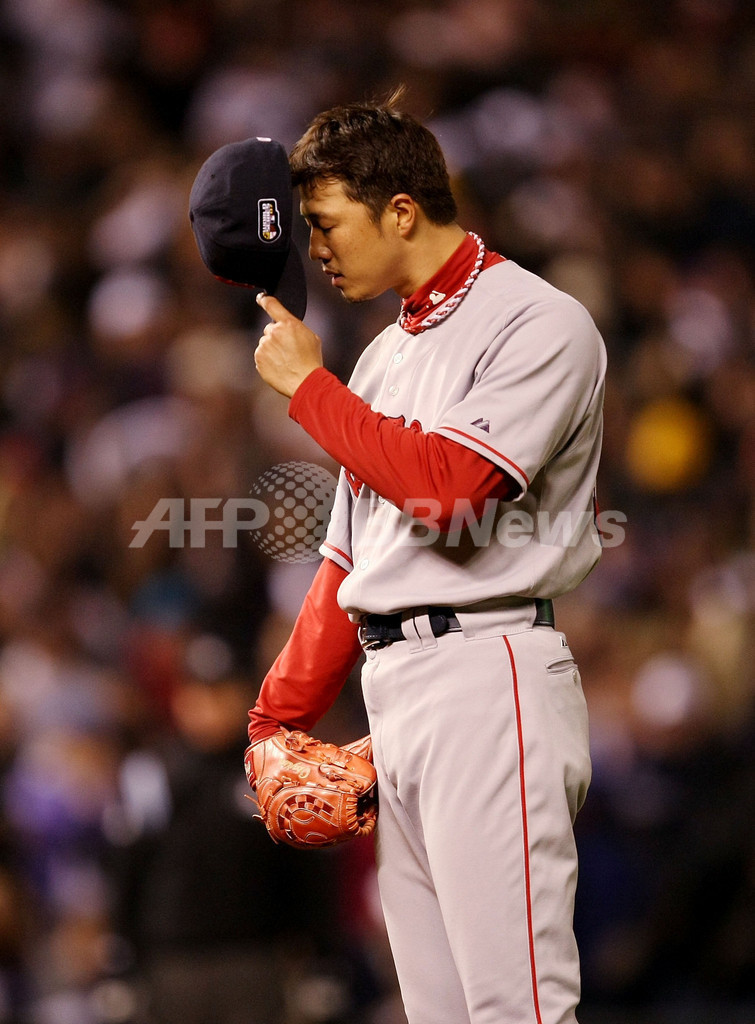 【10月28日 AFP】07MLBワールドシリーズ、コロラド・ロッキーズ(Colorado Rockies)vsボストン・レッドソックス(Boston Red Sox)第3戦。無死一・三塁の7回途中から4番手で登板したレッドソックスの岡島秀樹(Hideki Okajima)は、ロッキーズのマット・ホリデイ(Matt Holliday)に3ラン本塁打を浴びるなど1回2安打1失点2奪三振でマウンドを降りた。試合はレッドソックスが10-5で勝利し、レッドソックスは3連勝を飾りワールドシリーズ制覇に王手をかけた。(c)AFP/Getty Images