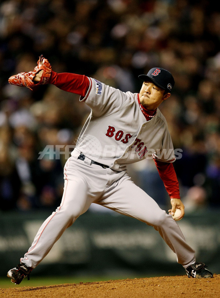 【10月28日 AFP】07MLBワールドシリーズ、コロラド・ロッキーズ(Colorado Rockies)vsボストン・レッドソックス(Boston Red Sox)第3戦。無死一・三塁の7回途中から4番手で登板したレッドソックスの岡島秀樹(Hideki Okajima)は、ロッキーズのマット・ホリデイ(Matt Holliday)に3ラン本塁打を浴びるなど1回2安打1失点2奪三振でマウンドを降りた。試合はレッドソックスが10-5で勝利し、レッドソックスは3連勝を飾りワールドシリーズ制覇に王手をかけた。(c)AFP/Getty Images