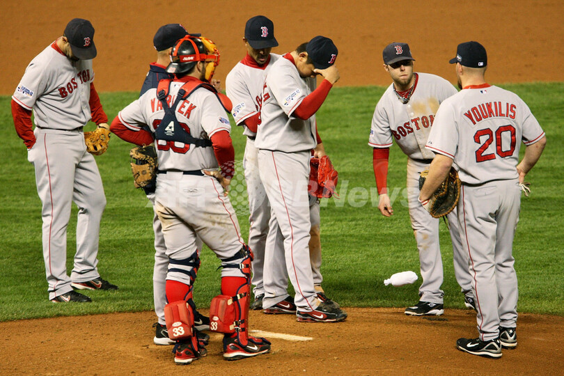 【10月28日 AFP】07MLBワールドシリーズ、コロラド・ロッキーズ(Colorado Rockies)vsボストン・レッドソックス(Boston Red Sox)第3戦。無死一・三塁の7回途中から4番手で登板したレッドソックスの岡島秀樹(Hideki Okajima)は、ロッキーズのマット・ホリデイ(Matt Holliday)に3ラン本塁打を浴びるなど1回2安打1失点2奪三振でマウンドを降りた。試合はレッドソックスが10-5で勝利し、レッドソックスは3連勝を飾りワールドシリーズ制覇に王手をかけた。(c)AFP/Getty Images