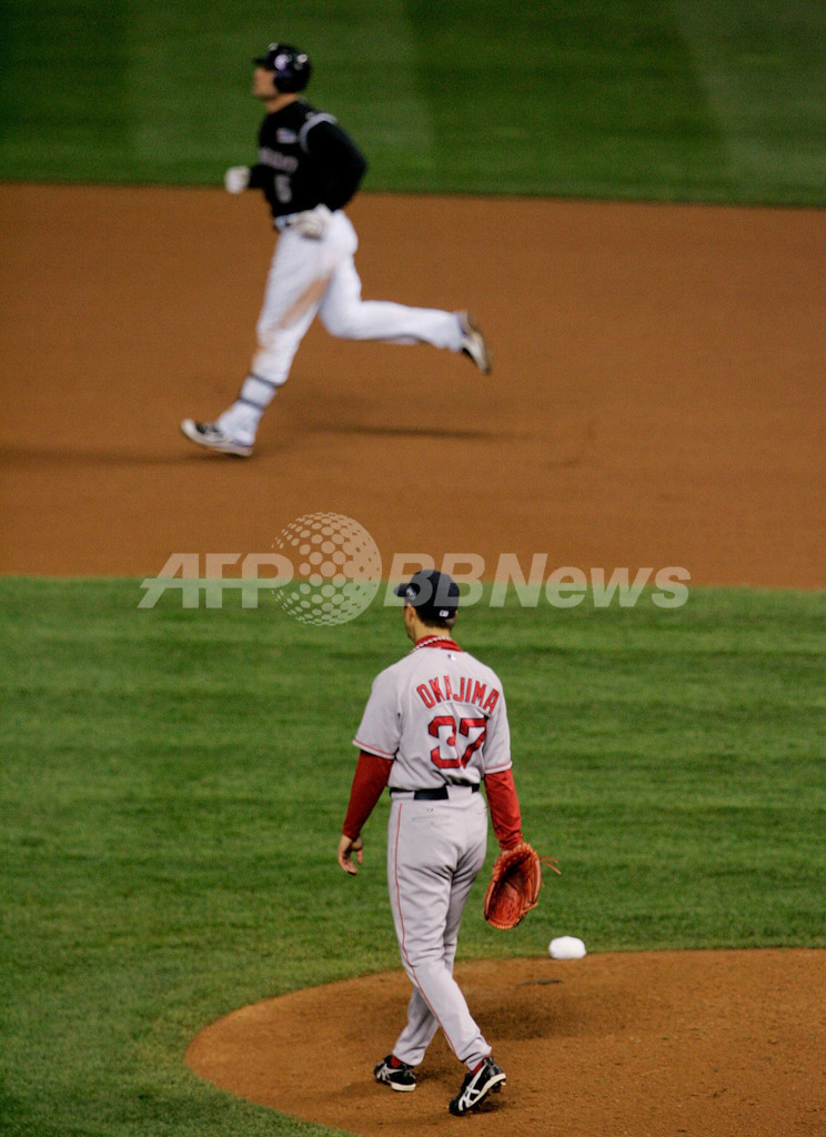 【10月28日 AFP】07MLBワールドシリーズ、コロラド・ロッキーズ(Colorado Rockies)vsボストン・レッドソックス(Boston Red Sox)第3戦。無死一・三塁の7回途中から4番手で登板したレッドソックスの岡島秀樹(Hideki Okajima)は、ロッキーズのマット・ホリデイ(Matt Holliday)に3ラン本塁打を浴びるなど1回2安打1失点2奪三振でマウンドを降りた。試合はレッドソックスが10-5で勝利し、レッドソックスは3連勝を飾りワールドシリーズ制覇に王手をかけた。(c)AFP/Getty Images