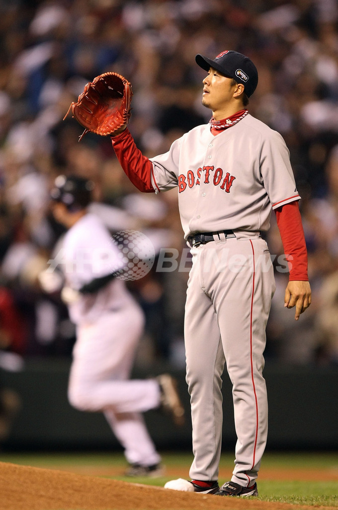 【10月29日 AFP】07MLBワールドシリーズ、コロラド・ロッキーズ(Colorado Rockies)vsボストン・レッドソックス(Boston Red Sox)第4戦。8回から4番手で登板したレッドソックスの岡島秀樹(Hideki Okajima)は、一死一塁の場面でロッキーズのギャレット・アトキンズ(Garrett Atkins)に2ラン本塁打を打たれ、2安打2失点を喫し1/3回で降板した。試合はレッドソックスが4-3でロッキーズを降し4連勝を飾り、3年ぶりにワールドシリーズを制覇した。(c)AFP/Getty Images