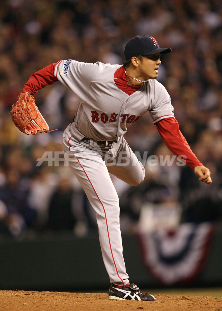 【10月29日 AFP】07MLBワールドシリーズ、コロラド・ロッキーズ(Colorado Rockies)vsボストン・レッドソックス(Boston Red Sox)第4戦。8回から4番手で登板したレッドソックスの岡島秀樹(Hideki Okajima)は、一死一塁の場面でロッキーズのギャレット・アトキンズ(Garrett Atkins)に2ラン本塁打を打たれ、2安打2失点を喫し1/3回で降板した。試合はレッドソックスが4-3でロッキーズを降し4連勝を飾り、3年ぶりにワールドシリーズを制覇した。(c)AFP/Getty Images