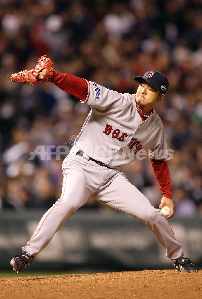 【10月29日 AFP】07MLBワールドシリーズ、コロラド・ロッキーズ(Colorado Rockies)vsボストン・レッドソックス(Boston Red Sox)第4戦。8回から4番手で登板したレッドソックスの岡島秀樹(Hideki Okajima)は、一死一塁の場面でロッキーズのギャレット・アトキンズ(Garrett Atkins)に2ラン本塁打を打たれ、2安打2失点を喫し1/3回で降板した。試合はレッドソックスが4-3でロッキーズを降し4連勝を飾り、3年ぶりにワールドシリーズを制覇した。(c)AFP/Getty Images