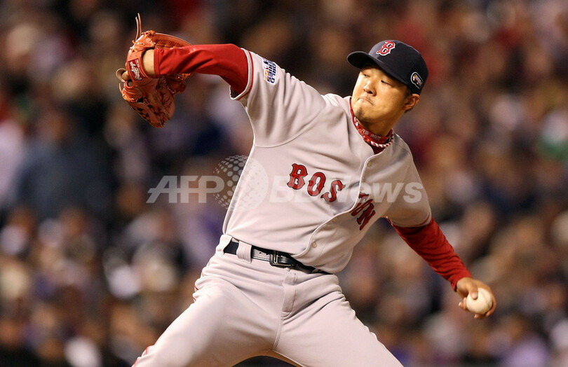 【10月29日 AFP】07MLBワールドシリーズ、コロラド・ロッキーズ(Colorado Rockies)vsボストン・レッドソックス(Boston Red Sox)第4戦。8回から4番手で登板したレッドソックスの岡島秀樹(Hideki Okajima)は、一死一塁の場面でロッキーズのギャレット・アトキンズ(Garrett Atkins)に2ラン本塁打を打たれ、2安打2失点を喫し1/3回で降板した。試合はレッドソックスが4-3でロッキーズを降し4連勝を飾り、3年ぶりにワールドシリーズを制覇した。(c)AFP/Getty Images