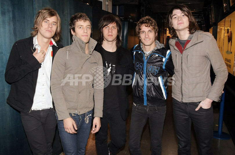 2007年10月29日、MTVの音楽情報番組「Total Request Live」に出演した米国バンド、ジ・アカデミー・イズ(The Academy Is...)の(左から)ギタリストのマイケル・ガイ・チスレット(%%Michael Guy Chislett%%)、ドラマーのアンディ・ムロテク(%%Andy Mrotek%%)、ベーシストのアダム・シスカ(%%Adam Siska%%)、フロントマンのウィリアム・ベケット(%%William Beckett%%)。(c)AFP/Getty Images Scott Gries