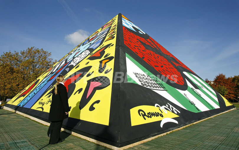 【10月31日 AFP】ロンドン(London)のハイドパーク(Hyde Park)に30日、ブラジル人ポップアーティストのロメロ・ブリット(Romero Britto)氏が制作した約14メートルのピラミッドの彫刻が登場した。この作品は、ロンドンのO2アリーナ(O2 arena)で開かれる「ツタンカーメンとファラオの黄金時代(Tutankhamun and the Golden Age of the Pharaohs)」展の一環として製作されたもの。(c)AFP