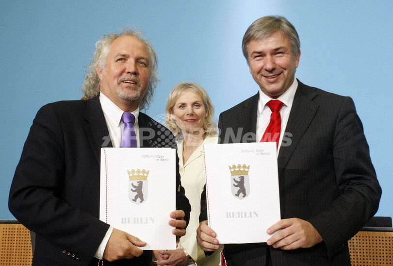 2007年10月31日、ベルリン・ドイツ・オペラ(Deutsche Oper Berlin)の総合音楽監督に2009年8月1日より就任する契約にサインした後、現音楽監督のひとり%%Kirsten Harms%%(中央)が見守る中、ポーズを取る英国人指揮者のドナルド・ラニクルズ(Donald Runnicles、左)とクラウス・ヴォーベレイト(%%Klaus Wowereit%%)ベルリン市長。(c)AFP/DDP/MARCUS BRANDT