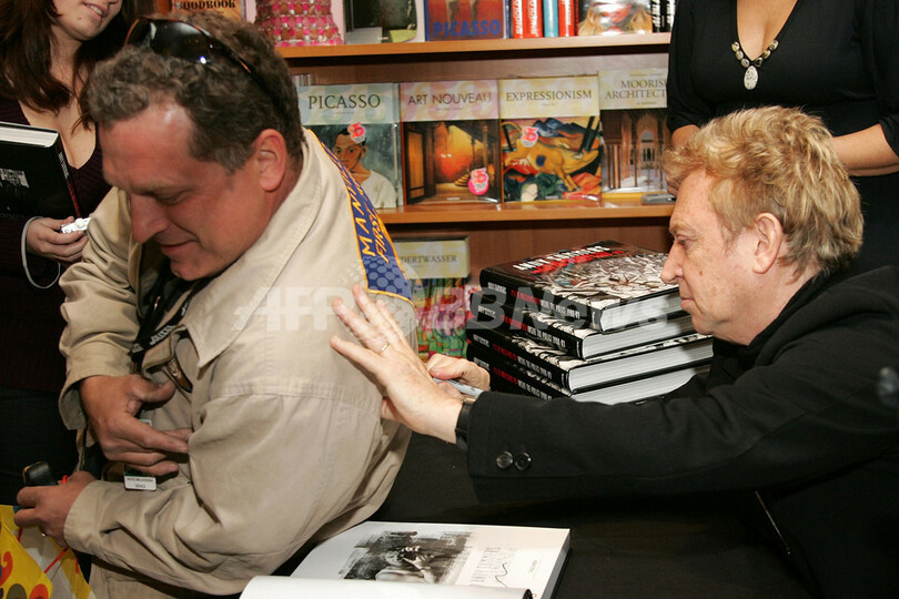 2007年11月1日、ニューヨーク市内の書店タッシェン(Taschen)で開催された新著『I’ll Be Watching You: Inside The Police, 1980-83』の発売記念サイン会に出席し、ファンのサインに応じるロックバンド、ポリス(The Police)のギタリスト、アンディー・サマーズ(Andy Summers、右)。(c)AFP/Getty Images Bryan Bedder