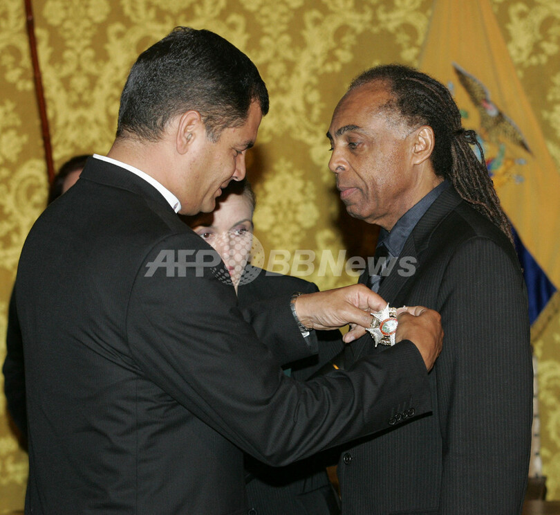 2007年10月31日、キト(Quito)のCarondelet Palaceでラファエル・コレア(Rafael Correa、左)大統領から勲章を受けたブラジル文化相で歌手/作曲家のジルベルト・ジル(Gilberto Gil)。(c)AFP/Rodrigo BUENDIA