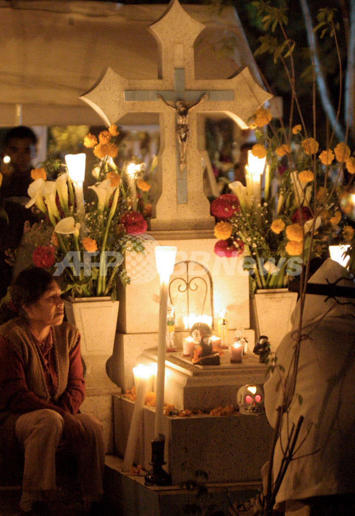2007年11月1日、メキシコ(Mexico)オアハカ(Oaxaca)州のSanta Cruz Xoxocotlan地域の墓地で「万霊節(Day of the Dead)」の日、死者の霊を慰め祈る人たち。(c)AFP/QUADRATIN-Jose Luis JERONIMO