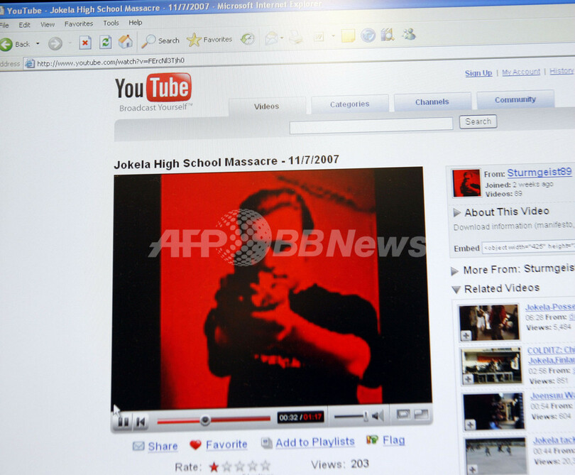 犯行予告とみられる動画は、「Jokela High School Massacre -- 11/7/2007」(1007年11月7日、ヨケラ高校の大量殺人)と題され、過去2週間以内に「Sturmgeist89」という投稿者名でユーチューブに投稿されたことがわかっている。大音量のヘビメタ音楽を背景に、事件現場となった学校の校舎がアップで映され、続いて赤い背景の中で若い男がカメラに向かって銃を構える内容だ。