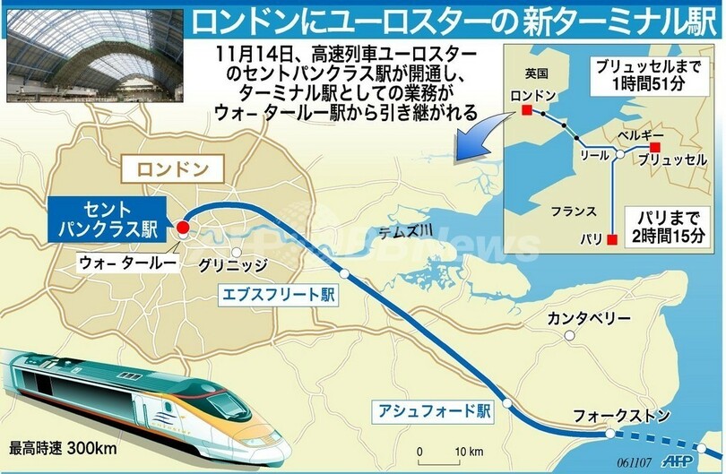 ニュース 政治・経済 図解 ロンドンにユーロスターの新ターミナル駅 2007年11月8日 22:35 発信地:ロンドン/英国 [ ヨーロッパ 英国 ] このニュースをシェア (c)AFP 【11月8日 AFP】図は、国際高速鉄道ユーロスター(Eurostar)の新ターミナル、セントパンクラス(St. Pancras)駅とその周辺をあらわしたもの。同駅は14日午後に開通し、英国とフランス・ベルギー間を走るユーロスターの新しい発着駅となる。(c)AFP<ニュース解説画像一覧へ> 政治・経済 一覧へ> メディア・報道関係・法人の方向け 写真・動画 購入のお問合せ>