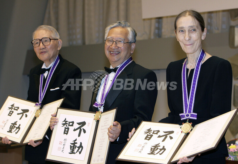 【11月10日 AFP】国立京都国際会館(Kyoto International Conference Center)で10日、科学技術・文明の発展に貢献した人々に贈られる「第23回京都賞(Kyoto Prize)」の授賞式が行われ、東京大学(Tokyo University)の井口洋夫(Hiroo Inokuchi)名誉教授、カリフォルニア工科大学(California Institute of Technology)の金森博雄(Hiroo Kanamori)名誉教授、ドイツの振付師ピナ・バウシュ(Pina Bausch)さんが受賞した。(c)AFP