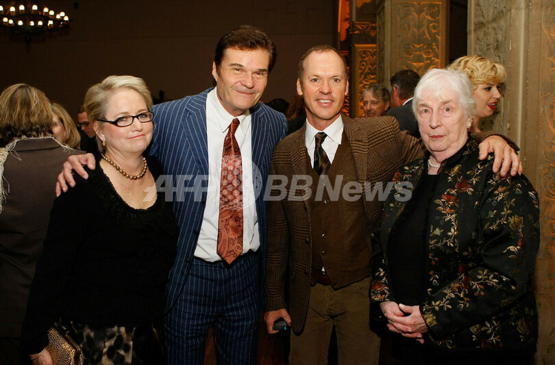 2007年11月10日、ロサンゼルス市内で開催された、俳優の故ピーター・ボイル(Peter Boyle)を称えるチャリティーイベントととして行われたコメディー公演に登場したピーター・ボイル(Peter Boyle)の妻のロレイン・アルタマン・ボイル(%%Loraine Alterman Boyle%%、左)、俳優のフレッド・ウィラード(%%Fred Willard%%、左2)、俳優のマイケル・キートン(%%Michael Keaton%%、右2)。(c)AFP/Getty Images Mark Davis
