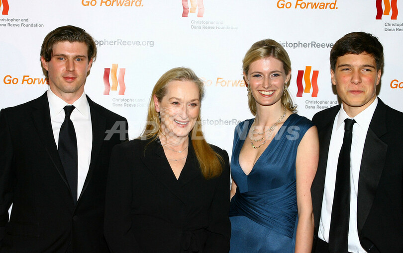 2007年11月12日、ニューヨーク市内のマリオット・マーキスホテル(Marriott Marquis Hotel)で開かれた「クリストファー&ダナ・リーヴ財団(Christopher&Dana Reeve Foundation、CRF)」主催のディナーパーティーに姿を見せた(左から)マシュー・リーヴ(%%Matthew Reeve%%)、女優のメリル・ストリープ(%%Meryl Streep%%)、アレキサンドラ・リーブ(%%Alexandra Reeve%%)、ウィル・リーヴ(%%Will Reeve%%)。(c)AFP/Getty Images Scott Wintrow