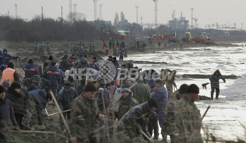 【11月14日 AFP】黒海(Black Sea)周辺で暴風雨のためタンカーなど船舶5隻が難破した事故で14日、ロシア軍兵士数百人が流出した2000トンにおよぶ重油の回収作業にあたった。