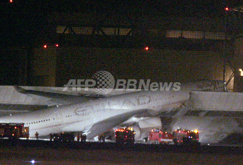 エアバス社は、「搭乗していた9人は全員退避したが、けがの状態は分からない。事故機は何らかの原因で傾き始め、防音壁に乗りあげたが、原因は不明だ」と話している。(c)AFP