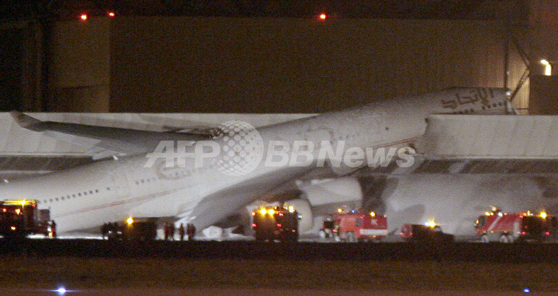 エアバス社は、「搭乗していた9人は全員退避したが、けがの状態は分からない。事故機は何らかの原因で傾き始め、防音壁に乗りあげたが、原因は不明だ」と話している。(c)AFP