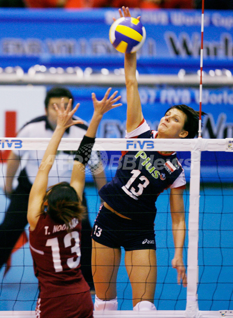 【11月16日 AFP】バレーボールW杯2007(FIVB Volleyball World Cup 2007)・女子・第4ラウンド、ポーランドvsタイ。試合はポーランドがセットカウント3-0(25-15、25-17、25-22)のストレートでタイを降し通算7勝5敗の6位で大会を終えた。一方タイは、2勝9敗の10位に終わった。(c)AFP