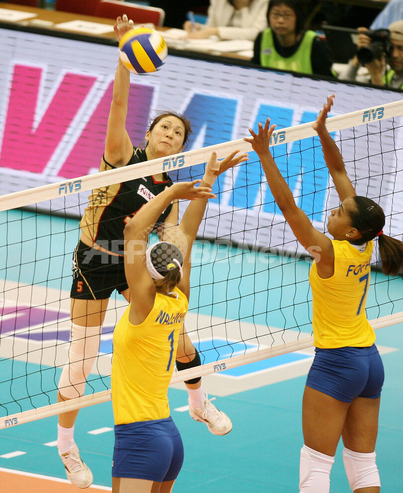 【11月16日 AFP】バレーボールW杯2007(FIVB Volleyball World Cup 2007)・女子・第4ラウンド、日本vsブラジル。試合は日本がセットカウント1-3(16-25、25-23、18-25、18-25)でブラジルに敗れ、通算成績6勝5敗の7位で大会を終えた。一方、勝利したブラジルは通算成績9勝2敗の2位で大会を終えた。(c)AFP