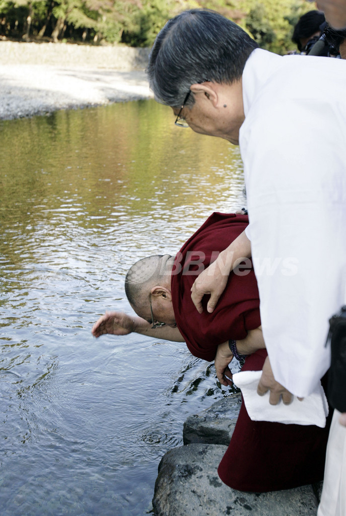 ダライ・ラマは15日に来日し、10日間滞在する予定。伊勢神宮参拝は2度目で、日本の伝統に従って2度拝礼し、五十鈴川(Isuzu river)の水で体を清めた。