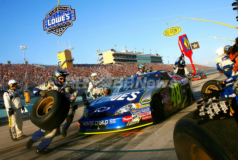 【11月19日 AFP】NASCAR・ネクステルカップ・シリーズ(2007 NASCAR Nextel Cup Series)・第36戦・フォード400(Ford 400)・決勝。ポールポジションからスタートしたヘンドリック・モータースポーツ/シボレー(Hendrick Motorsports Chevrolet)のジミー・ジョンソン(Jimmie Johnson)は、7位で終え151ポイント(267周)を加え合計6723ポイントで2年連続の年間総合優勝を果たした。(c)AFP/Getty Images