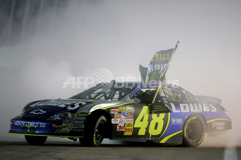 【11月19日 AFP】NASCAR・ネクステルカップ・シリーズ(2007 NASCAR Nextel Cup Series)・第36戦・フォード400(Ford 400)・決勝。ポールポジションからスタートしたヘンドリック・モータースポーツ/シボレー(Hendrick Motorsports Chevrolet)のジミー・ジョンソン(Jimmie Johnson)は、7位で終え151ポイント(267周)を加え合計6723ポイントで2年連続の年間総合優勝を果たした。(c)AFP/Getty Images