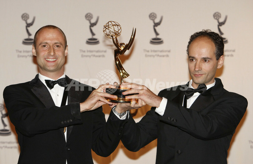 2007年11月19日、ヒルトン・ニューヨーク(Hilton New York)で開催された「第35回国際エミー賞(35th International Emmy Awards)」の授賞式に登場し、ミニシリーズ・テレビ映画部門の作品賞(%%Best TV Movie/Mini series%%)を受賞したテレビ映画『大統領暗殺(%%Death of a President%%)』のガブリエル・レンジ(%%Gabriel Range%%)監督(左)、脚本家のサイモン・フィンチ(%%Simon Finch%%)。(c)AFP/Stan HONDA