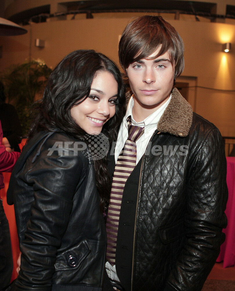 2007年11月19日、ロサンゼルス市内のハリウッド・アンド・ハイランド(Hollywood and Highland)で開催されたDVD『ハイスクール・ミュージカル2 プレミアム・エディション(%%High School Musical 2: Extended Edition%%)』のリリース記念イベントのアフターパーティーに出席した女優のヴァネッサ・ハジンズ(%%Vanessa Hudgens%%、左)と俳優のザック・エフロン(%%Zac Efron%%)。(c)AFP/Getty Images Kevin Winter