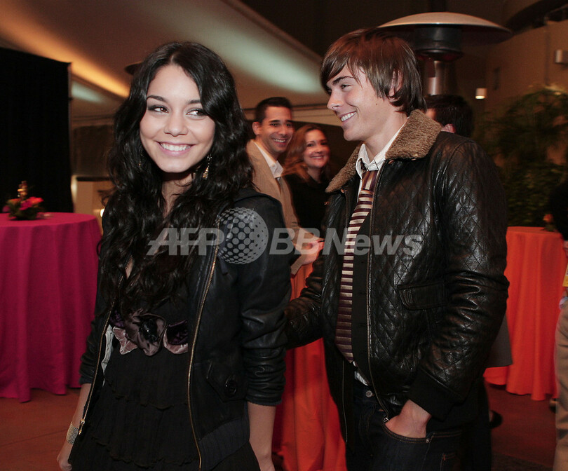 2007年11月19日、ロサンゼルス市内のハリウッド・アンド・ハイランド(Hollywood and Highland)で開催されたDVD『ハイスクール・ミュージカル2 プレミアム・エディション(%%High School Musical 2: Extended Edition%%)』のリリース記念イベントのアフターパーティーに出席した女優のヴァネッサ・ハジンズ(%%Vanessa Hudgens%%、左)と俳優のザック・エフロン(%%Zac Efron%%)。(c)AFP/Getty Images Kevin Winter