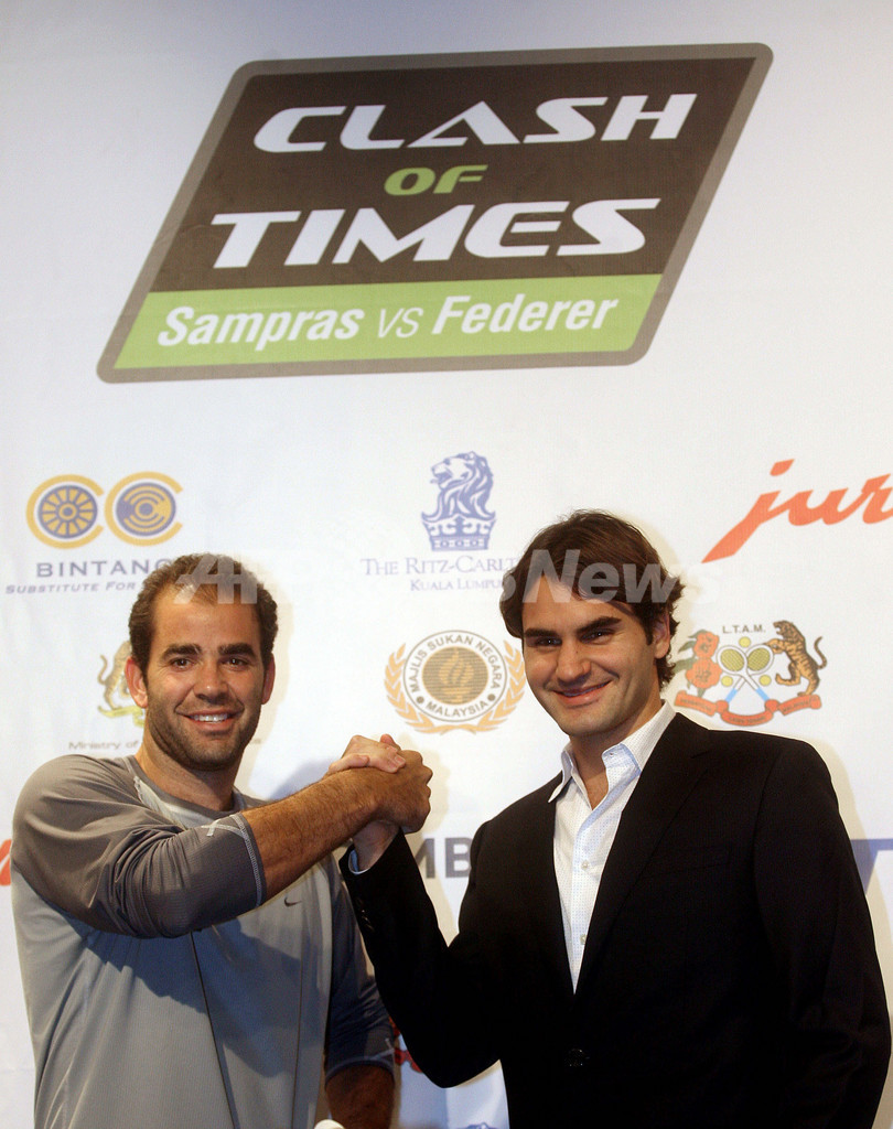 スポーツ テニス エキシビション第2戦目を控えサンプラス氏とフェデラーが会見 2007年11月21日 22:14 発信地:クアラルンプール/マレーシア [ アジア・オセアニア マレーシア ] このニュースをシェア ‹ › ❮ 1/2 ❯ 会見で手を取り合って笑顔を見せるサンプラス氏(左)とフェデラー。(c)AFP 画像作成中 ! 【11月21日 AFP】元世界ランキンク1位のピート・サンプラス(Pete Sampras、米国)氏と現在世界ランキング1位のロジャー・フェデラー(Roger Federer、スイス)が対戦するエキシビションマッチ開催を翌22日に控え、試合が行われるマレーシアのクアラルンプール(Kuala Lumpur)で記者会見が行われた。今回の試合は、マレーシアの独立50周年を記念して行われる。(c)AFP テニス 一覧へ> メディア・報道関係・法人の方向け 写真・動画 購入のお問合せ>