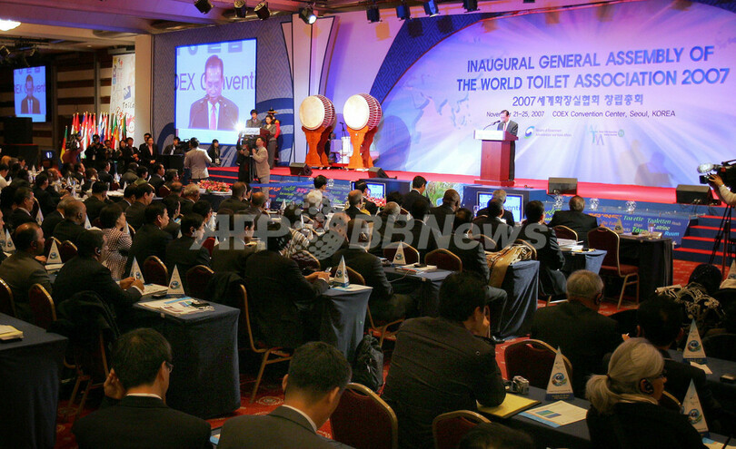 世界トイレ協会の発足提唱者である韓国の沈載徳(シム・ジェドク、Sim Jae-Duck)氏は、協会のキャンペーンを宣伝するため、160万ドル(約1億7000万円)を投じてトイレの形をした自宅まで建てた。22日の創立総会には、60を超える国から衛生当局の職員や衛生関連企業関係者ら約1300人が出席した。(c)AFP/Park Chan-Kyong