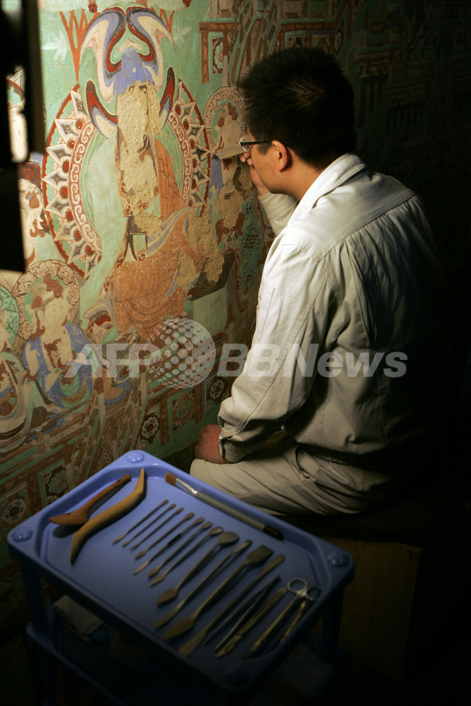 ニュース ライフ 世界遺産の敦煌莫高窟で壁画の修復が進行中 2007年11月30日 17:03 発信地:敦煌/中国 [ 中国・台湾 中国 ] このニュースをシェア ‹ › ❮ 5/8 ❯ 2007年10月24日、中国北西部甘粛(Gansu)省にある仏教遺跡、敦煌莫高窟(Mogao Grottoes)で進められる壁画の修復作業。(c)AFP/Peter PARKS 画像作成中 ! 【11月30日 AFP】中国北西部甘粛(Gansu)省にあり、ユネスコ(UNESCO)の世界遺産にも登録されている仏教遺跡、敦煌莫高窟(Mogao Grottoes)では、洞穴内部に描かれた数々の壁画の修復作業が進められている。これらの壁画はブッダへの永遠のささげ物として1650年前ごろから制作され始めたが、観光客や気候変動の影響などもあり、年とともに不鮮明になっている。(c)AFP ライフ 一覧へ> メディア・報道関係・法人の方向け 写真・動画 購入のお問合せ>