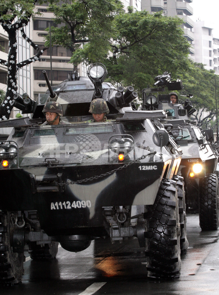 【11月29日 AFP】(30日写真追加)フィリピンのマニラ(Manila)首都圏マカティ(Makati)市内で29日、ペニンシュラ・ホテル(Peninsula Hotel)に反乱将校らのグループが立てこもりグロリア・アロヨ(Gloria Arroyo)大統領の辞任を要求していた事件は、同日午後、治安部隊がホテルに突入。反乱グループは全員投降し身柄を拘束された。