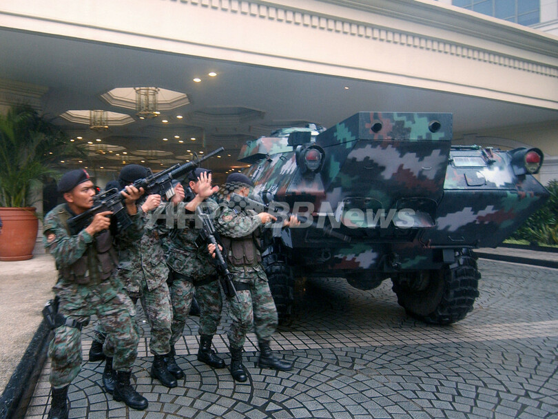 【11月29日 AFP】(30日写真追加)フィリピンのマニラ(Manila)首都圏マカティ(Makati)市内で29日、ペニンシュラ・ホテル(Peninsula Hotel)に反乱将校らのグループが立てこもりグロリア・アロヨ(Gloria Arroyo)大統領の辞任を要求していた事件は、同日午後、治安部隊がホテルに突入。反乱グループは全員投降し身柄を拘束された。