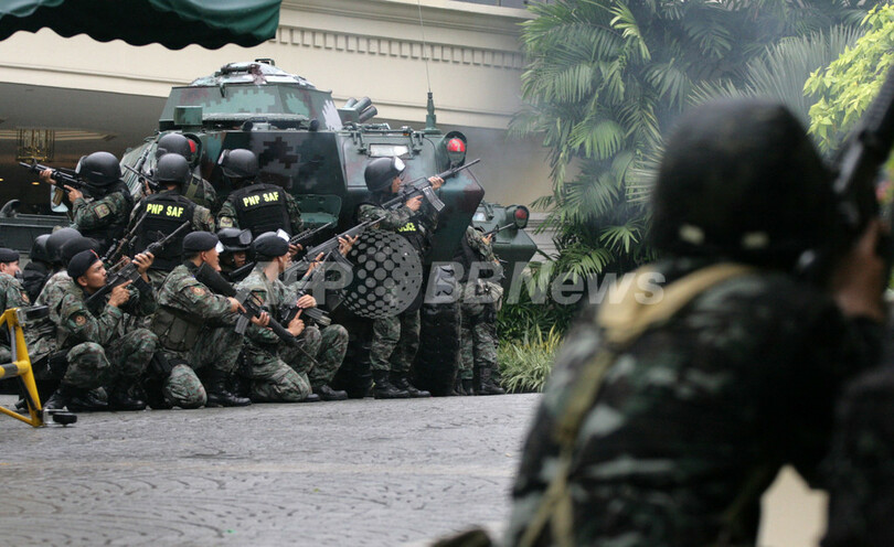 立てこもりを続ける反乱グループに対し、治安部隊は催涙ガスを撃ち込みホテルへの突入を開始すると、反乱グループは催涙ガスの白煙が消え次第、投降すると報道陣に語っていた。