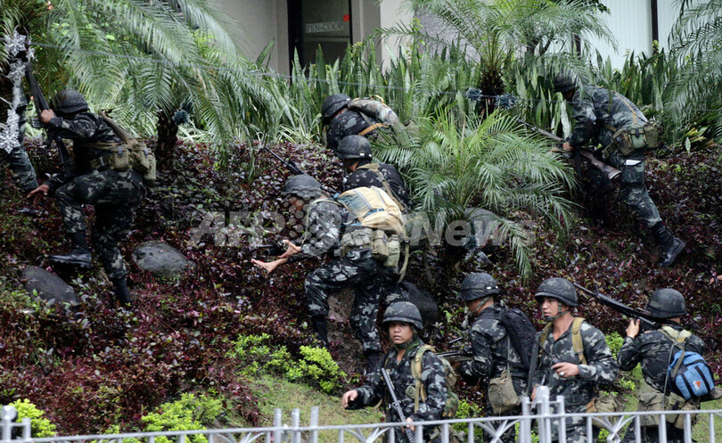 【11月29日 AFP】(30日写真追加)フィリピンのマニラ(Manila)首都圏マカティ(Makati)市内で29日、ペニンシュラ・ホテル(Peninsula Hotel)に反乱将校らのグループが立てこもりグロリア・アロヨ(Gloria Arroyo)大統領の辞任を要求していた事件は、同日午後、治安部隊がホテルに突入。反乱グループは全員投降し身柄を拘束された。