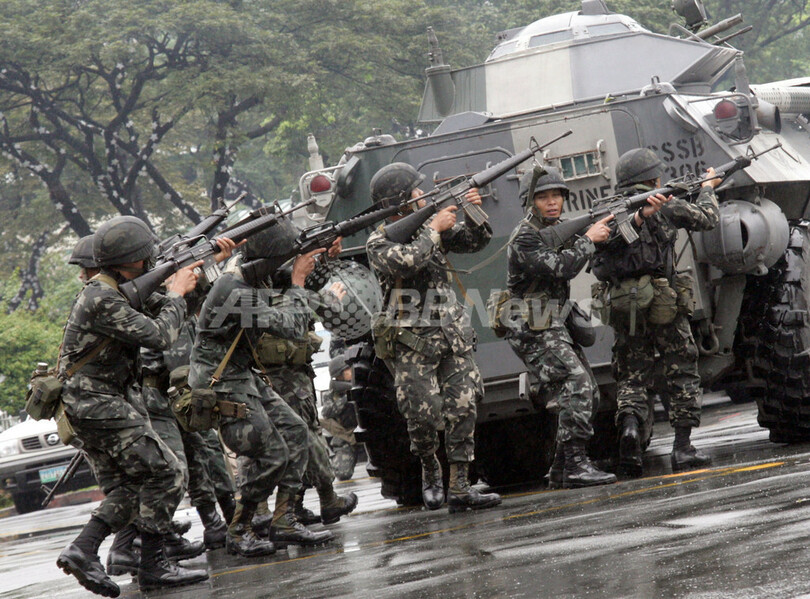 【11月29日 AFP】(30日写真追加)フィリピンのマニラ(Manila)首都圏マカティ(Makati)市内で29日、ペニンシュラ・ホテル(Peninsula Hotel)に反乱将校らのグループが立てこもりグロリア・アロヨ(Gloria Arroyo)大統領の辞任を要求していた事件は、同日午後、治安部隊がホテルに突入。反乱グループは全員投降し身柄を拘束された。
