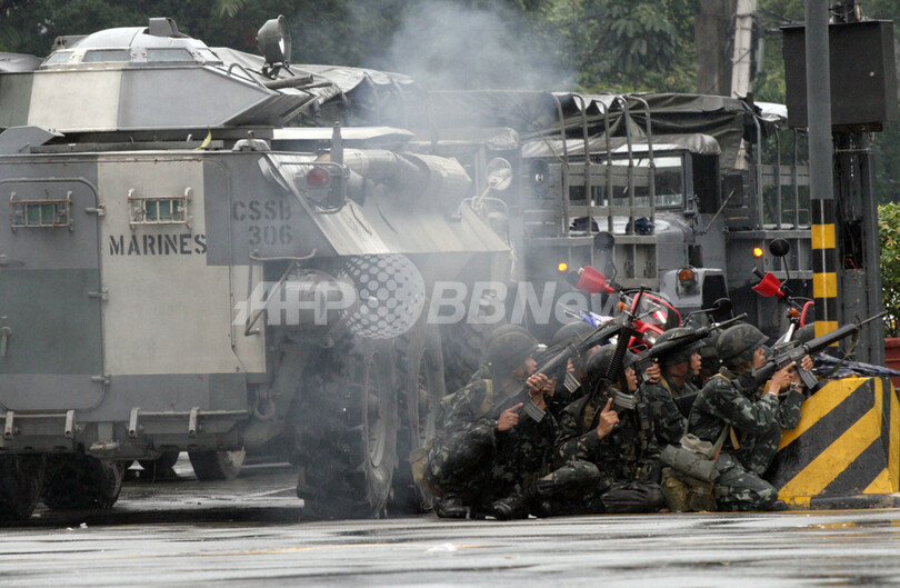 【11月29日 AFP】(30日写真追加)フィリピンのマニラ(Manila)首都圏マカティ(Makati)市内で29日、ペニンシュラ・ホテル(Peninsula Hotel)に反乱将校らのグループが立てこもりグロリア・アロヨ(Gloria Arroyo)大統領の辞任を要求していた事件は、同日午後、治安部隊がホテルに突入。反乱グループは全員投降し身柄を拘束された。