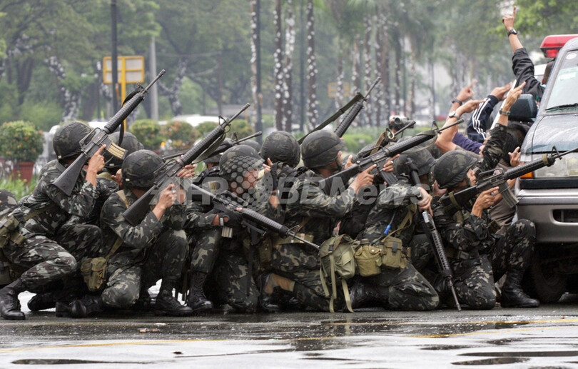 【11月29日 AFP】(30日写真追加)フィリピンのマニラ(Manila)首都圏マカティ(Makati)市内で29日、ペニンシュラ・ホテル(Peninsula Hotel)に反乱将校らのグループが立てこもりグロリア・アロヨ(Gloria Arroyo)大統領の辞任を要求していた事件は、同日午後、治安部隊がホテルに突入。反乱グループは全員投降し身柄を拘束された。